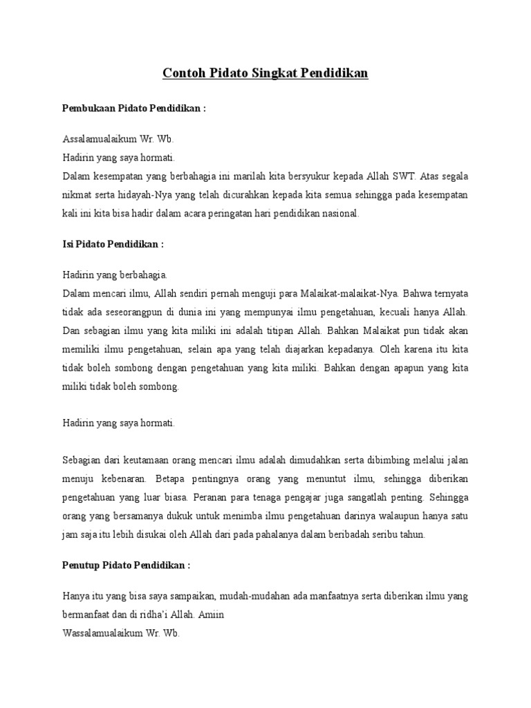 Mulai dari maulid nabi, kebersihan, narkoba, lingkungan, pendidikan. Saya tutup dengan ucapan, hamdalah bersama. Berikut adalah contoh pidato singkat tentang menyambut bulan suci ramadhan beserta dalilnya, selengkapnya disini. Sekian pidato singkat dari saya, kurang lebihnya mohon maaf. Selamat pagi/siang/malam, semuanya, semoga kita semua berada dalam .